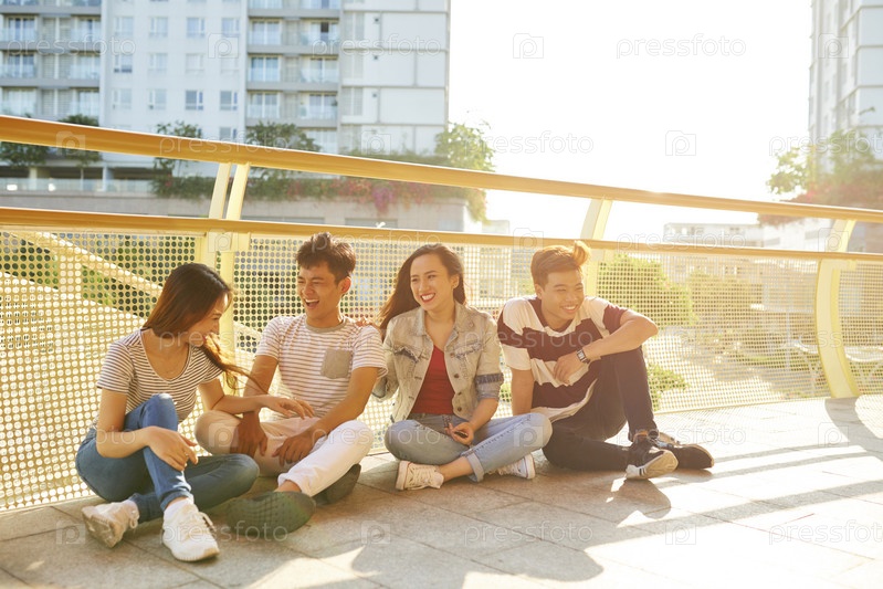 Веселые друзья, сидящие на мосту