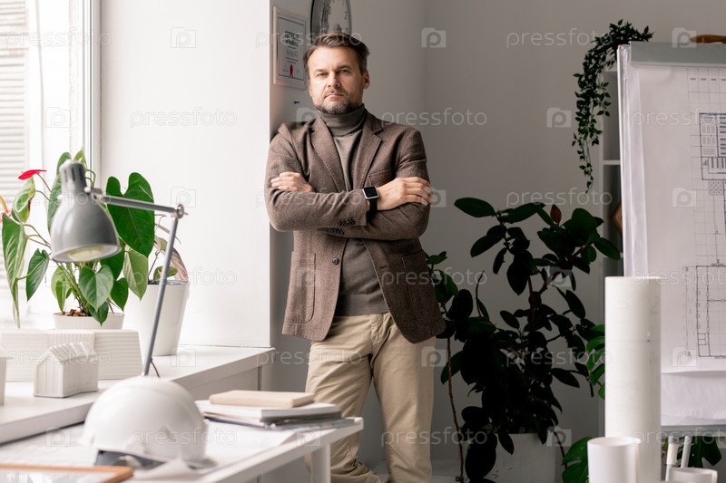 Серьезный архитектор или инженер в формальной одежде, стоящий на рабочем месте у окна