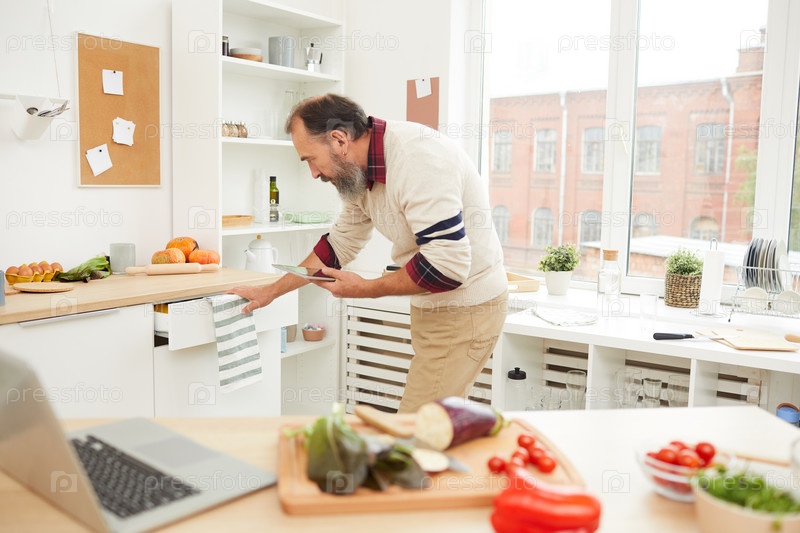 Бородатый старший мужчина на кухне
