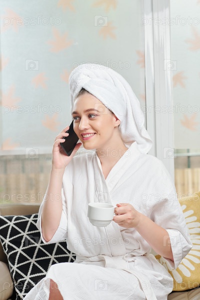 Женщина пьет кофе и отвечает на телефон
