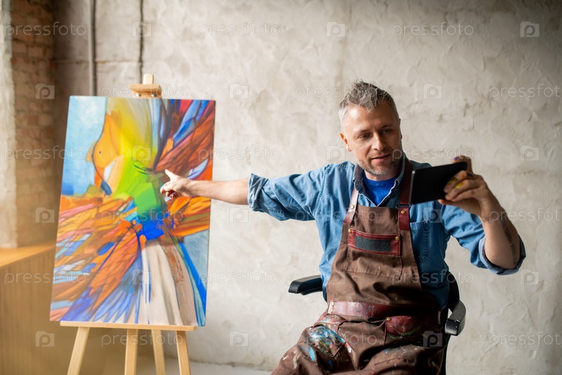 Современный художник со смартфоном, указывающий на произведения искусства на эстафете в студии