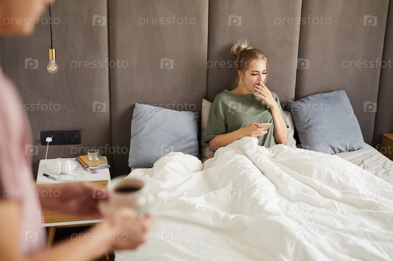Молодая зевая женщина со смартфоном, сидящая утром в постели