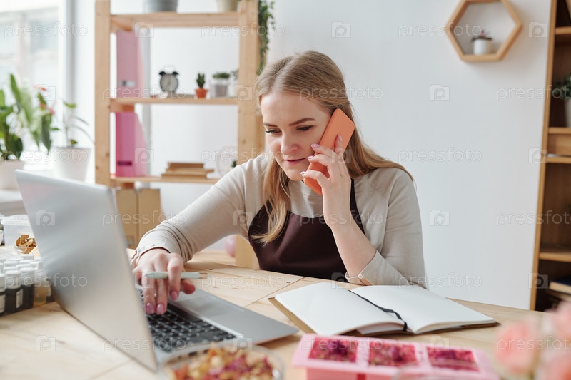 Загруженная женщина со смартфоном сидит перед ноутбуком и звонит своим клиентам