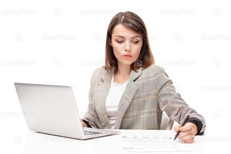Молодая серьёзная брокерша читает финансовые бумаги перед ноутбуком