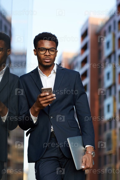 Портрет серьезного красивого молодого чернокожего предпринимателя в стильном костюме, стоящего возле здания и использующего телефон