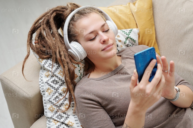 Довольно молодая спокойная женщина с дредольками, слушающая музыку в наушниках