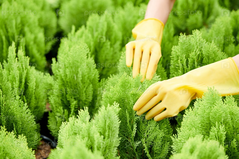 Садовник тщательно проверяет каждое растение кипариса