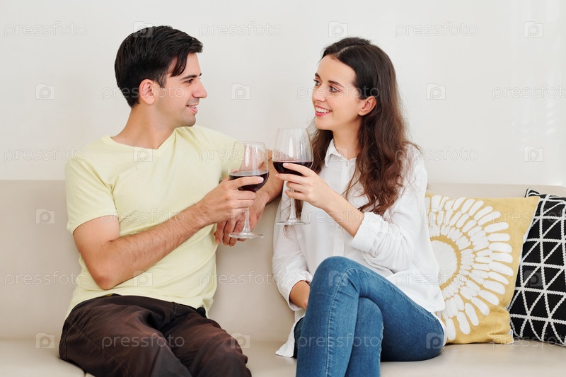 Веселая пара наслаждается вином и хорошим разговором
