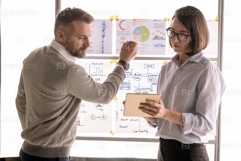 Серьезный бизнесмен смотрит на дисплей сенсорного панеля, который держит его коллега
