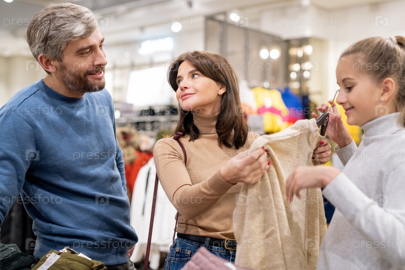 Родители выбирают новый пуловер для дочери в отделе повседневной одежды