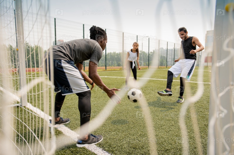 Молодой африканский футболист ловит мяч, в то время как его соперник пинает