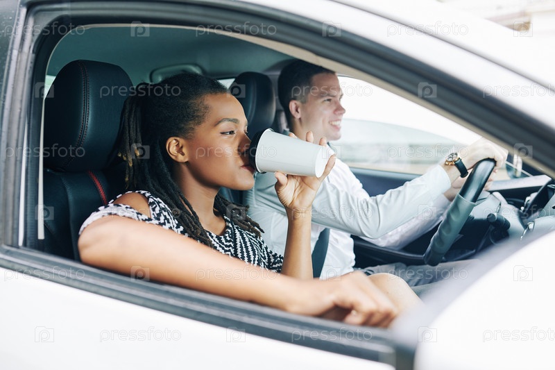 Женщина пьет кофе в машине