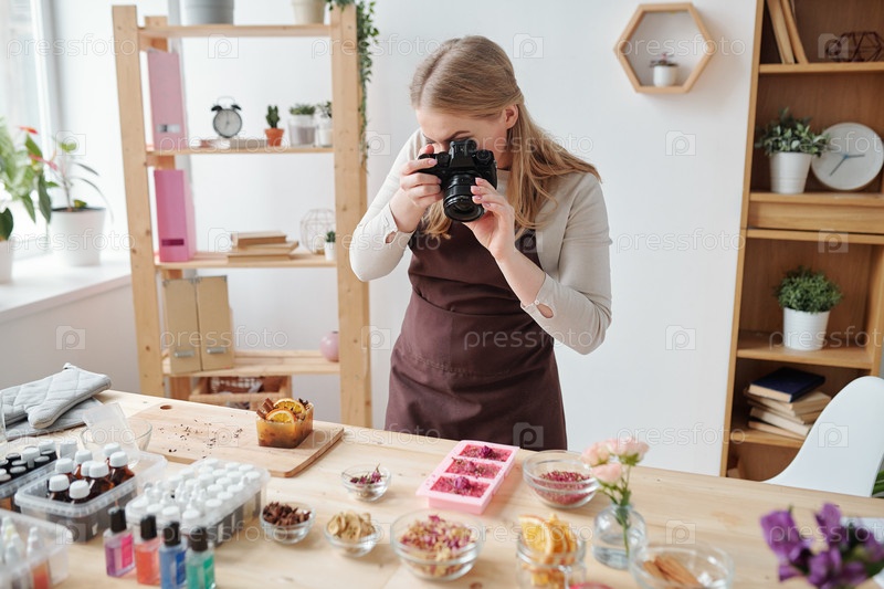 Молодая женщина снимает ингредиенты и ароматические вещи для изготовления ручного мыла