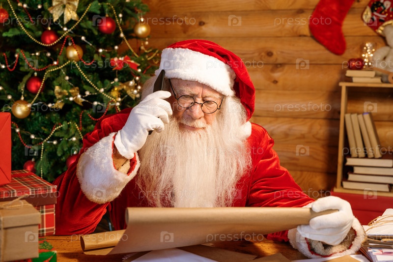 Санта с мобильным телефоном звонит родителям перед Рождеством