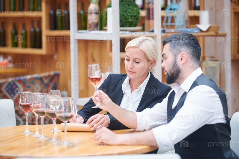 Два эксперта по виноделию обсуждают характеристики новых сортов вина в подвале