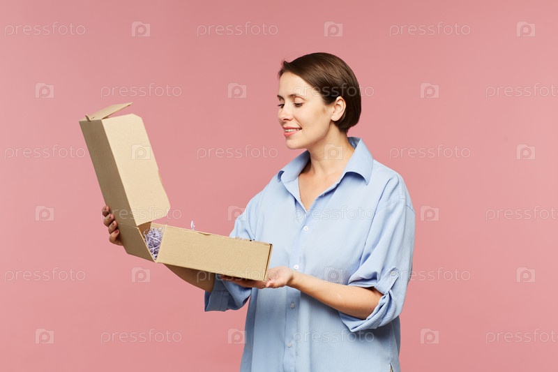 Счастливая молодая женщина с удивлением открывает коробку и смотрит на подарок