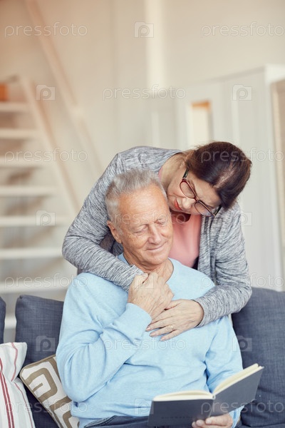 Удовлетворенный красивый пенсионер, обнимаемый женой, сидящий дома на диване и читающий интересную книгу