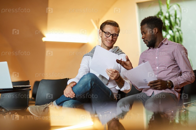 Веселые оптимистичные молодые мультиэтнические мужчины сидят на стульях в конференц-зале и вместе анализируют документы