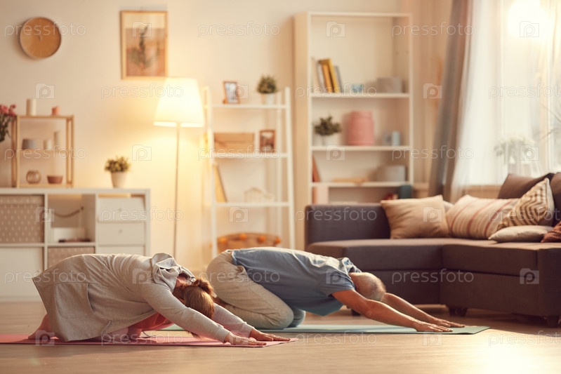 Активная зрелая пара, отдыхающая в детской позе во время совместной практики йоги дома