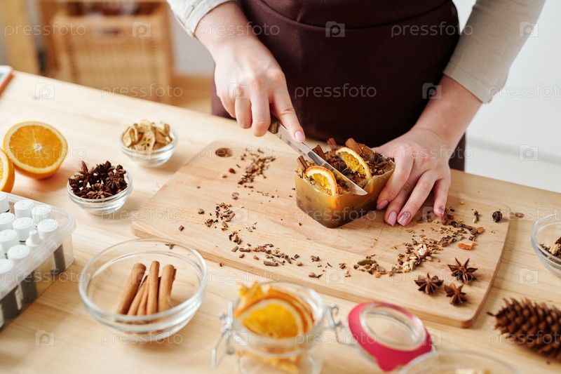 Руки молодой женщины с ножом режут большое ручное мыло на столе
