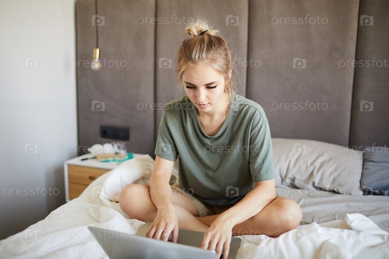 Милая блондинка в футболке печатает и смотрит на дисплей ноутбука