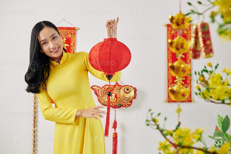 Женщина показывает украшения китайского Нового года