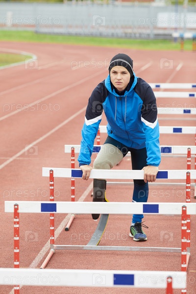 Серьезный вдумчивый молодой человек с протезом на правой ноге, опирающийся на препятствие на стадионе и смотрящий вдаль