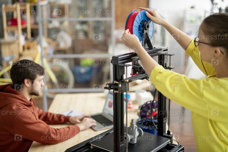 Молодая офисная работница меняет катушку с красной нитью на 3D-принтере