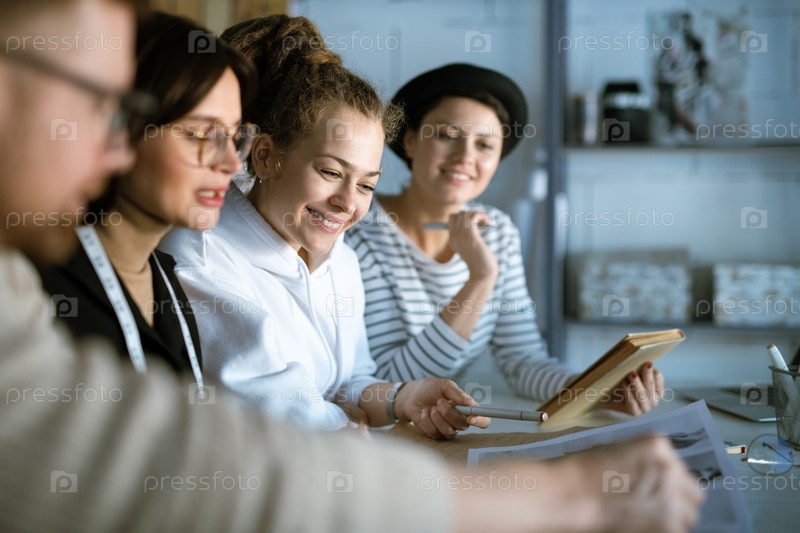 Молодые креативные модные дизайнеры обсуждают эскизы, собравшись в студии