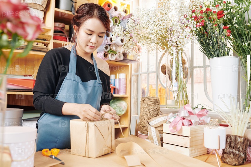 Женщина упаковывает подарки в цветочном магазине