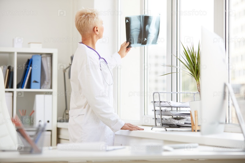 Занятая современная женщина-врач в лабораторном пальто стоит у окна и анализирует рентгеновское изображение колена