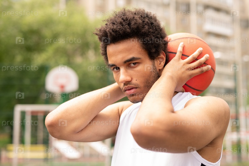 Молодой серьезный спортсмен держит мяч за шеей, чтобы играть в баскетбол