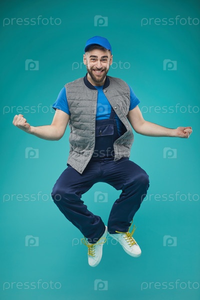 Счастливый мужской рабочий прыгает