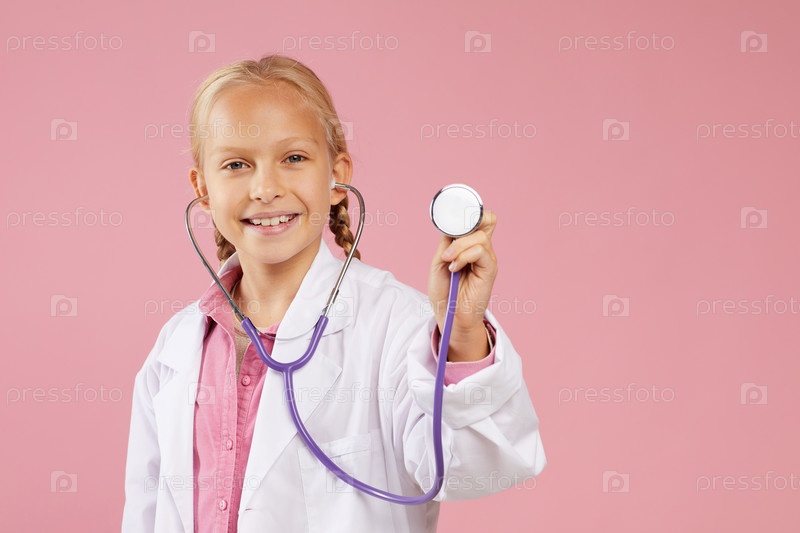 Портрет счастливой маленькой девочки в лабораторном пальто, стоящей на розовом фоне и использующей стетоскоп во время мечты стать врачом