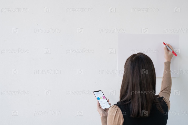 Обратный взгляд на молодую бизнесвумену или учительницу со смартфоном и подчеркивателем