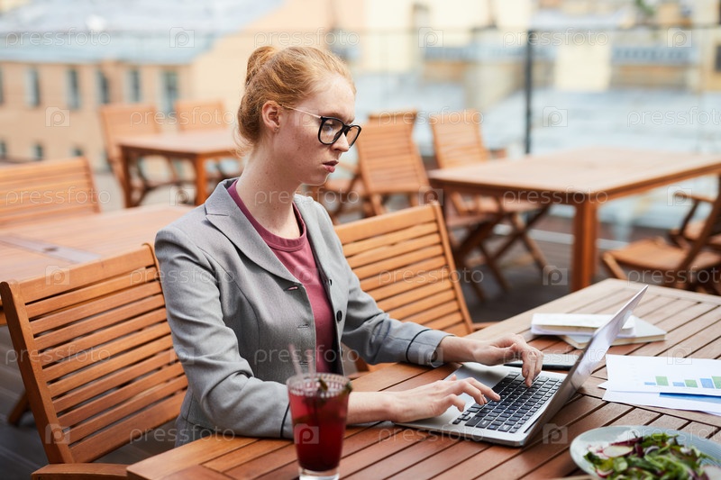 Фрилансер работает на ноутбуке в кафе