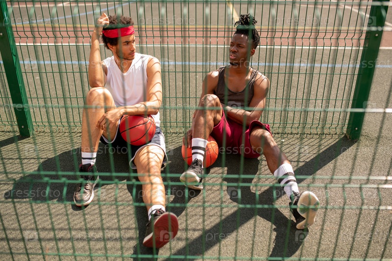 Один из молодых межкультурных баскетболистов рассказывает своему другу о деталях игры