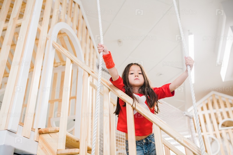 Милая маленькая азиатская девочка стоит на деревянной лестнице и держит за веревки