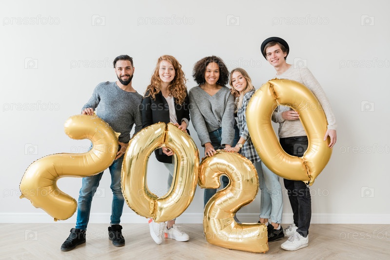 Группа веселых межкультурных молодых друзей, держащих надувные номера