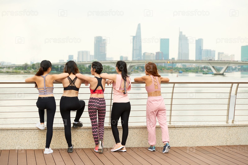 Женщины-спортсменки, стоящие вместе на берегу моря