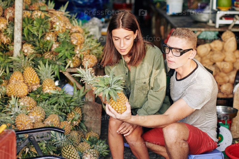Пара покупает ананасы