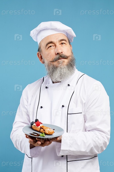 Бородатый шеф-повар держит десерт
