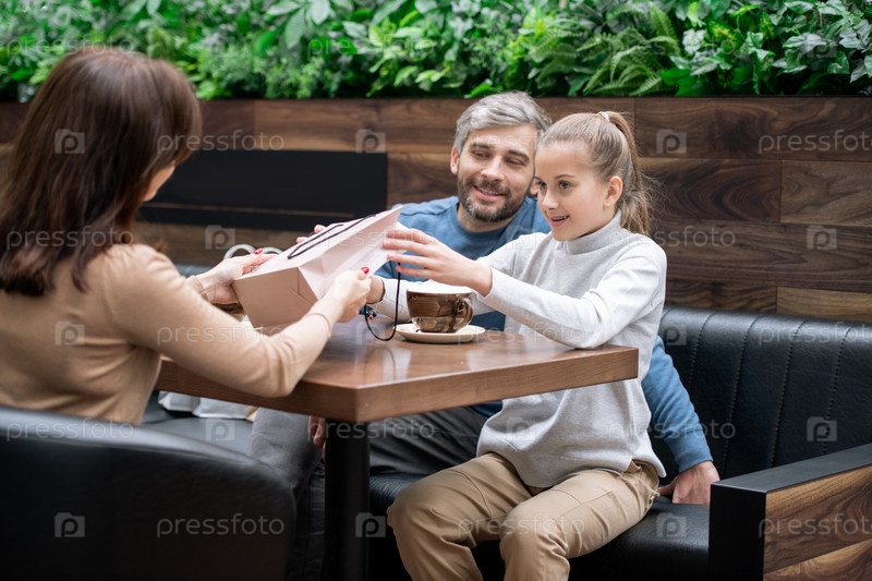 Молодые родители делают подарок на день рождения своей милой дочери в кафе