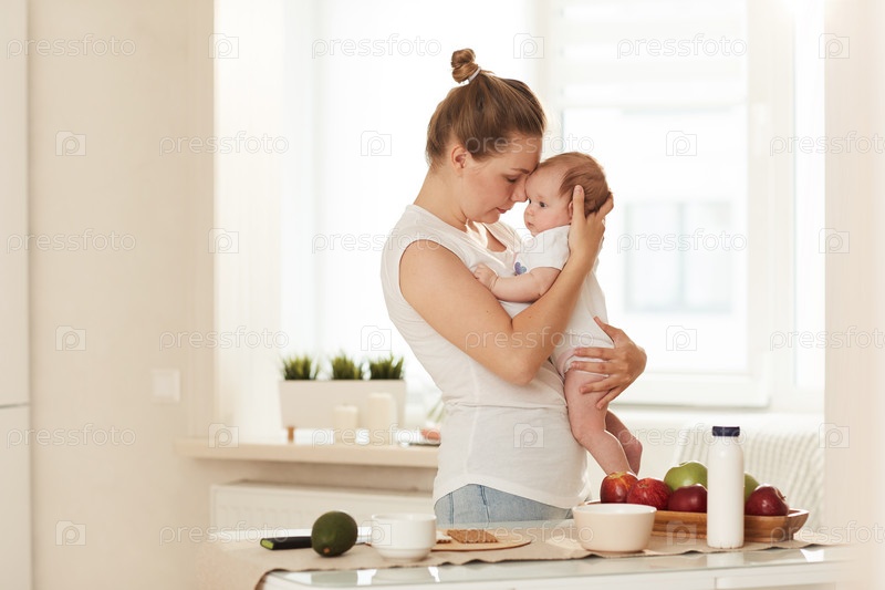 Молодая мать в белом футболке и синих джинсах обнимает маленького ребенка и прикасается к его лбу носом