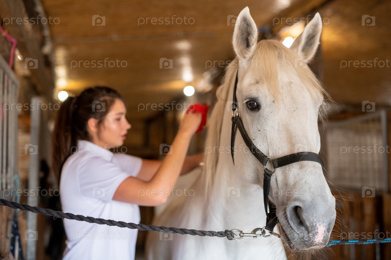 Женская опекунка чистит спину белой молодой чистокровной гоночной лошади в конюшне