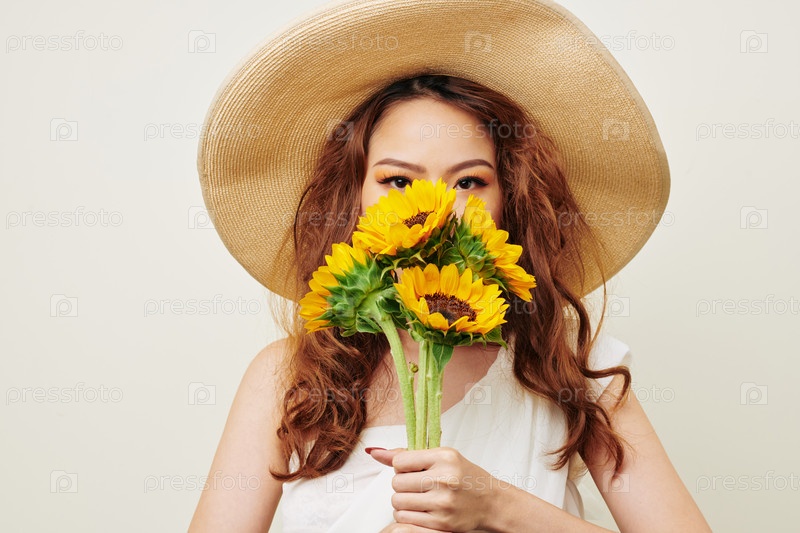 Женщина с букетом подсолнечников
