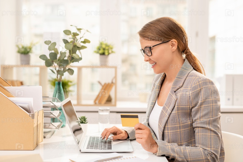 Довольно молодая элегантная деловая женщина, ищущая товары в интернет-магазине