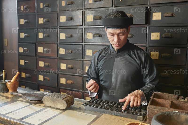 Практикующий азиатскую медицину в магазине трав