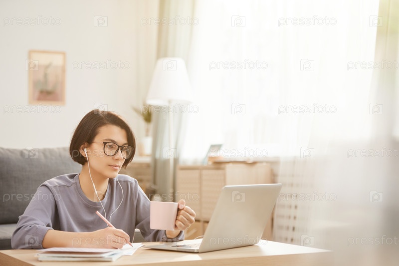Серьезный, внимательный молодой независимый специалист по очкам сидит за кофейным столом в уютной квартире и пьет кофе во время транскрипции аудио на текст