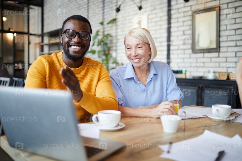 Веселые возбужденные коллеги по бизнесу в повседневной одежде, сидящие за столом в лофт-кафе и использующие ноутбук во время совместного просмотра дизайна сайта